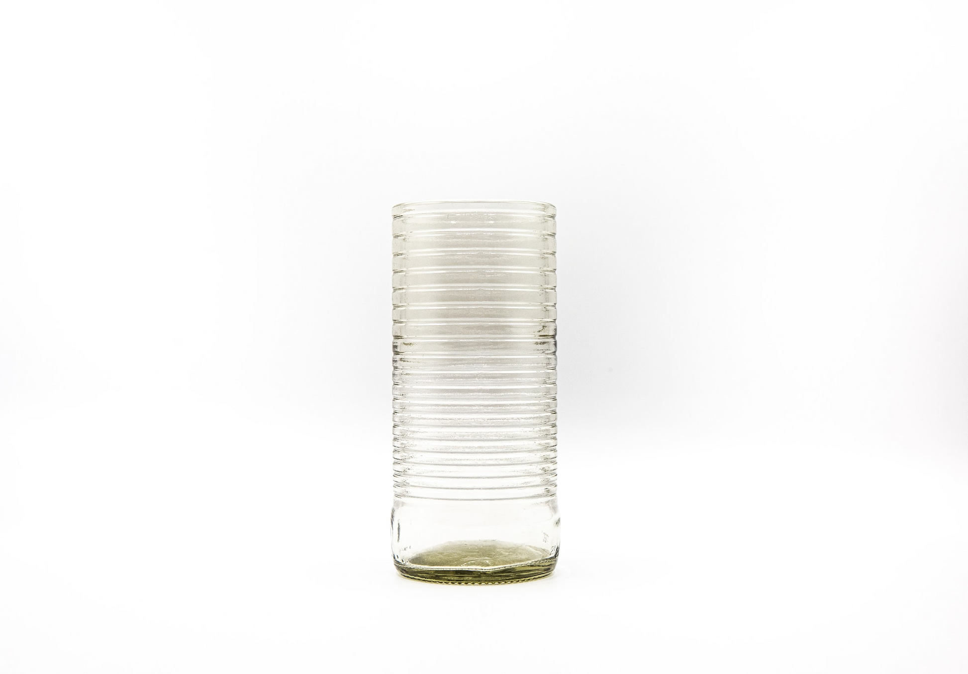 Our upcycling process - First step is to sort, clean and de-lable the bottles. Then we score and hot pop the tops off (this means we cut the glass by making a score mark on the surface. Then add a flame to the score mark and voila, it hot pops off). Next, we polish the rough popped lip to smooth out all the unevenness. This prepares the glass to use a torch to fire polish the lip so that we achieve a nice rounded glossy finish. Our last step is to anneal the glass in a glass kiln.