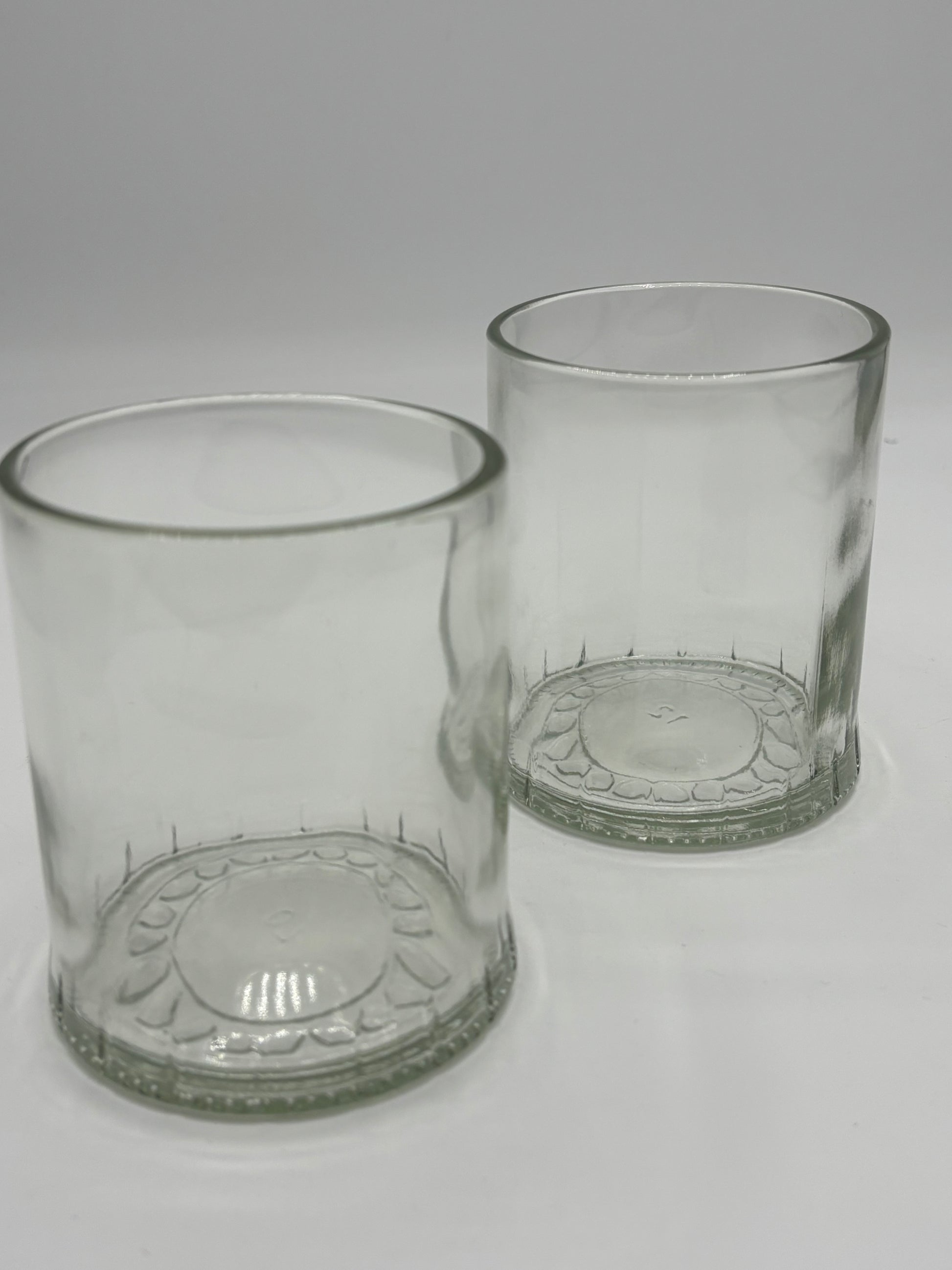 Our upcycling process - First step is to sort, clean and de-lable the bottles. Then we score and hot pop the tops off (this means we cut the glass by making a score mark on the surface. Then add a flame to the score mark and voila, it hot pops off). Next, we polish the rough popped lip to smooth out all the unevenness. This prepares the glass to use a torch to fire polish the lip so that we achieve a nice rounded glossy finish. Our last step is to anneal the glass in a glass kiln.