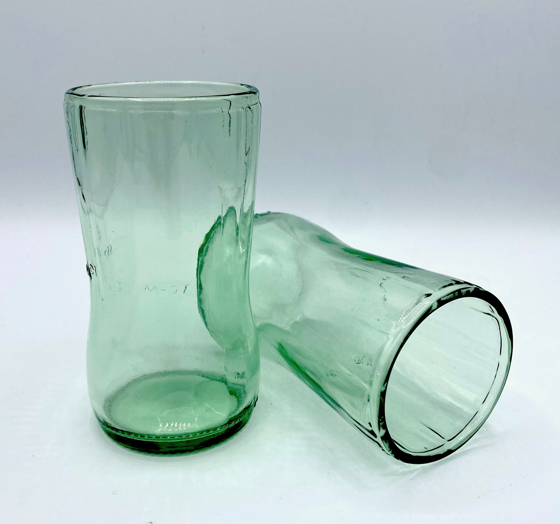 Our upcycling process - First step is to sort, clean and de-lable the bottles. Then we score and hot pop the tops off (this means we cut the glass by making a score mark on the surface. Then add a flame to the score mark and voila, it hot pops off). Next, we polish the rough popped lip to smooth out all the unevenness. This prepares the glass to use a torch to fire polish the lip so that we achieve a nice rounded glossy finish. Our last step is to anneal the glass in a glass kiln.